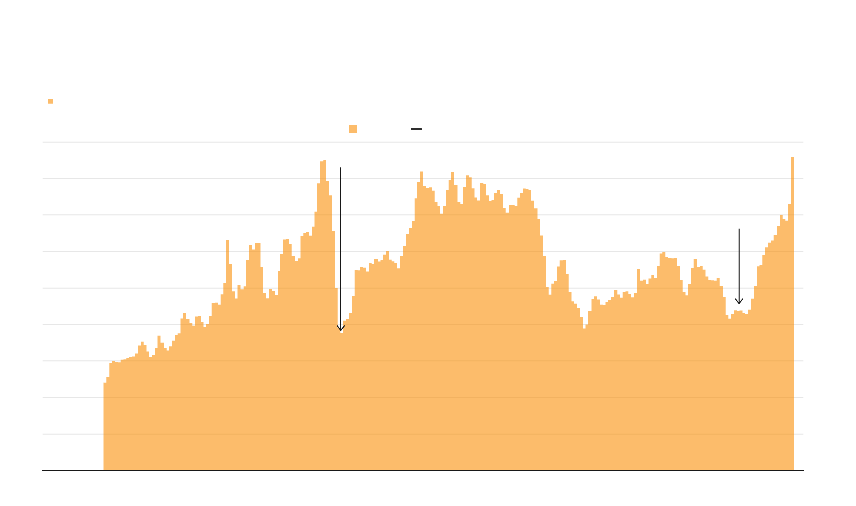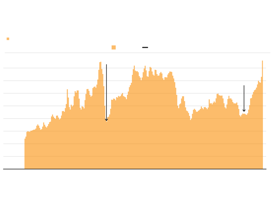 Price of gas has climbed to the levels seen before the Great recession in the late 2000s. Historically, gas price has slumped during recessions, perhaps due to lower demand. Gas prices declined at the onset of the pandemic but have since picked up. There's also the issue of the war in Ukraine affecting global oil production.